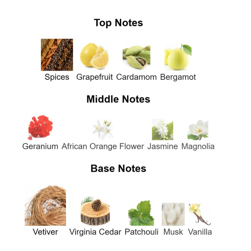 This masculine fragrance begins with a zesty start around grapefruit, which continues in tandem with a delicately spicy note. This grapefruit-spice duo gives way to a base of geranium, jasmine and magnolia,