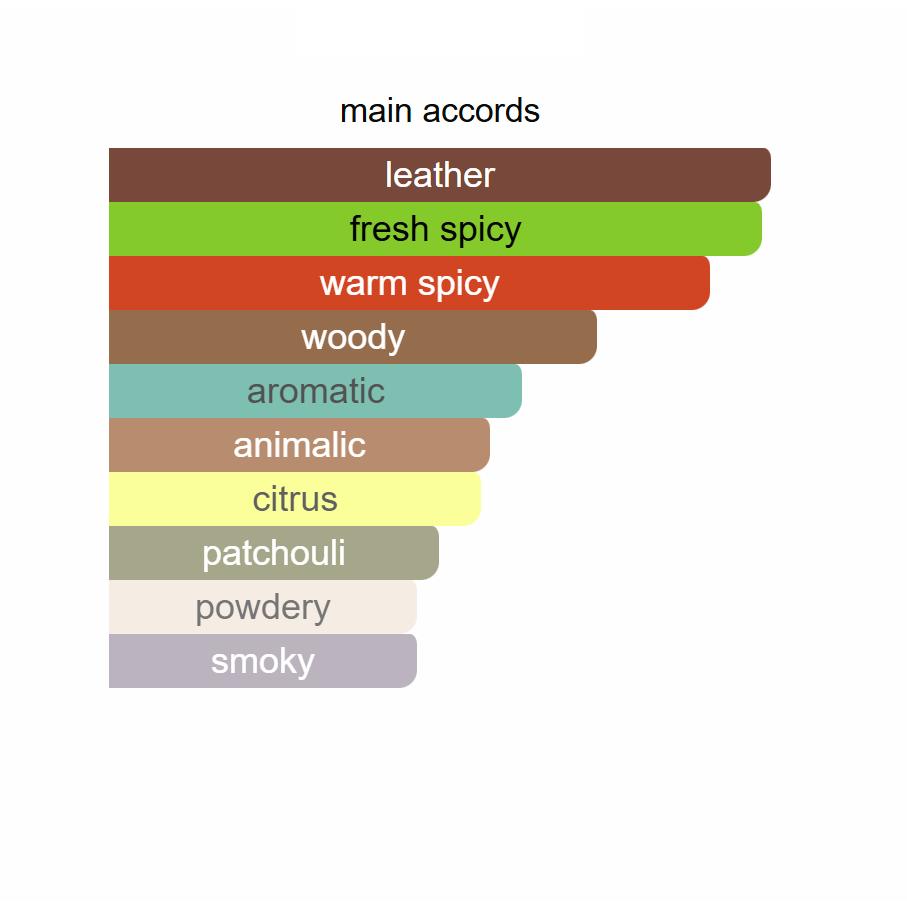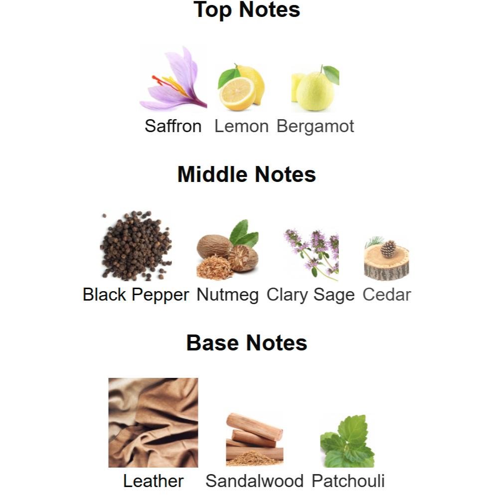 Intense from the top, with a fresh and green note of Bergamot, a sunny and zesty impact of Lemon, and a fluid Saffron accord. At the heart, with a dry and woody Black Pepper and Nutmeg combination, a powerful aromatic Clary Sage, and a balsamic Cedarwood note. With a sensual, frank and unique Leather accord, a deep Sandalwood note, and a powerful and diffusive woody Patchouli with some tobaco tones.